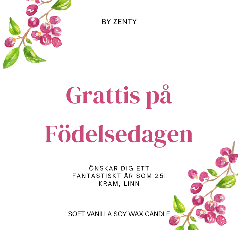 Skapa ett unikt ljus med ditt eget personliga meddelande! Välj bland våra 7 dofter och skriv en hälsning som ska stå på etiketten – namn, kort hälsning eller något speciellt.